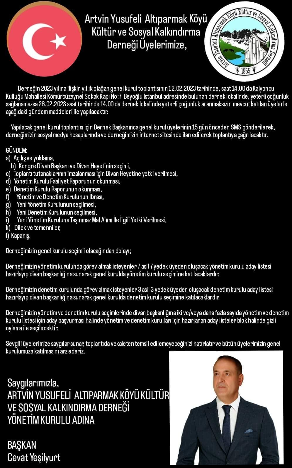 Artvin Yusufeli Altıparmak Köyü Kültür ve Sosyal Kalkındırma Derneği Üyelerimize, Derneğin 2023 yılına ilişkin yıllık olağan genel kurul toplantısının 12.02.2023 tarihinde, saat 14.00 da Kalyoncu Kulluğu Mahallesi Kömürcüzeynel So [...]